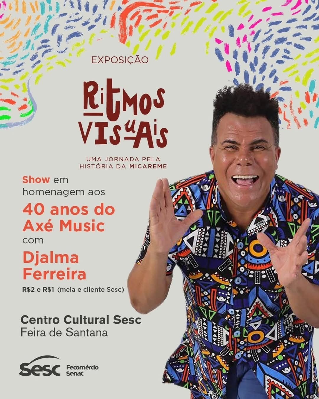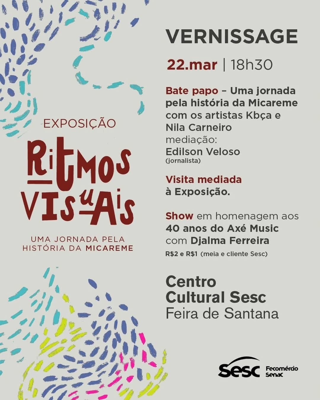 Em cartaz a partir do dia 22/03 no Centro Cultural Sesc Feira de Santana, a exposição Ritmos Visuais - Uma jornada pela história da Micareme conta a história de 88 anos da Micareta de Feira de Santana a partir das obras de quatro artistas baianos. No dia do lançamento, será realizada uma vernissage aberta ao público, às 18h30, com um bate-papo com os profissionais envolvidos no projeto, uma visitação mediada e o show do músico Djalma Ferreira (ingressos custam R$ 2 e R$1).Todas as obras são inéditas e foram criadas a partir da pesquisa do radialista, professor e pesquisador da festa, Edilson Veloso. A mostra tem curadoria da artista visual Nila Carneiro, que assina também a identidade visual do projeto, e entre os expositores estão os artistas Kbça, Ludimila Lima, Raiana Britto e Ana Reis.